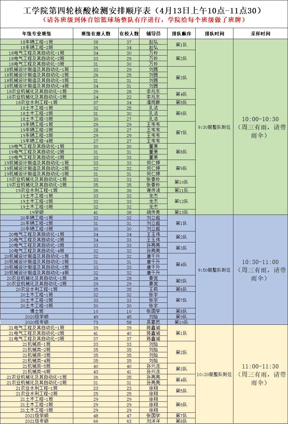 4月13日上午,合肥突降大雨和降温,工学院2282名在校本科和研究生按照之前制定的计划,在全体辅导员和班主任带领下,有条不紊地完成核酸检测,用时仅48分钟,比预定时间提前42分钟,速度较上一轮更快,秩序更好。