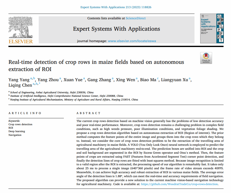 针对机器视觉的作物行检测普遍存在检测精度低、实时性差的问题,团队提出了一种基于感兴趣区域(ROI)自主提取的作物行检测算法,显著提高了作物行检测效率,处理单个图像(640*360像素)只需约25ms,视频流的帧速率超过40FPS,作物行拟合线的平均误差角为1.88°,能够满足野外导航的实时性和精度要求。该算法可以为当前基于机器视觉的农业机械导航技术提供一种新的解决方案。研究成果以“Real-time detection of crop rows in maize fields based on autonomous extraction of ROI”为题发表于Expert Systems With Applications (中科院1区,IF:8.665),代码已在github中开源。安徽农业大学为论文的第一完成单位,杨洋副教授为论文第一作者,陈黎卿教授为通讯作者,许良元教授参与了研究。研究得到国家自然基金项目和安徽高校协同创新项目的资助。