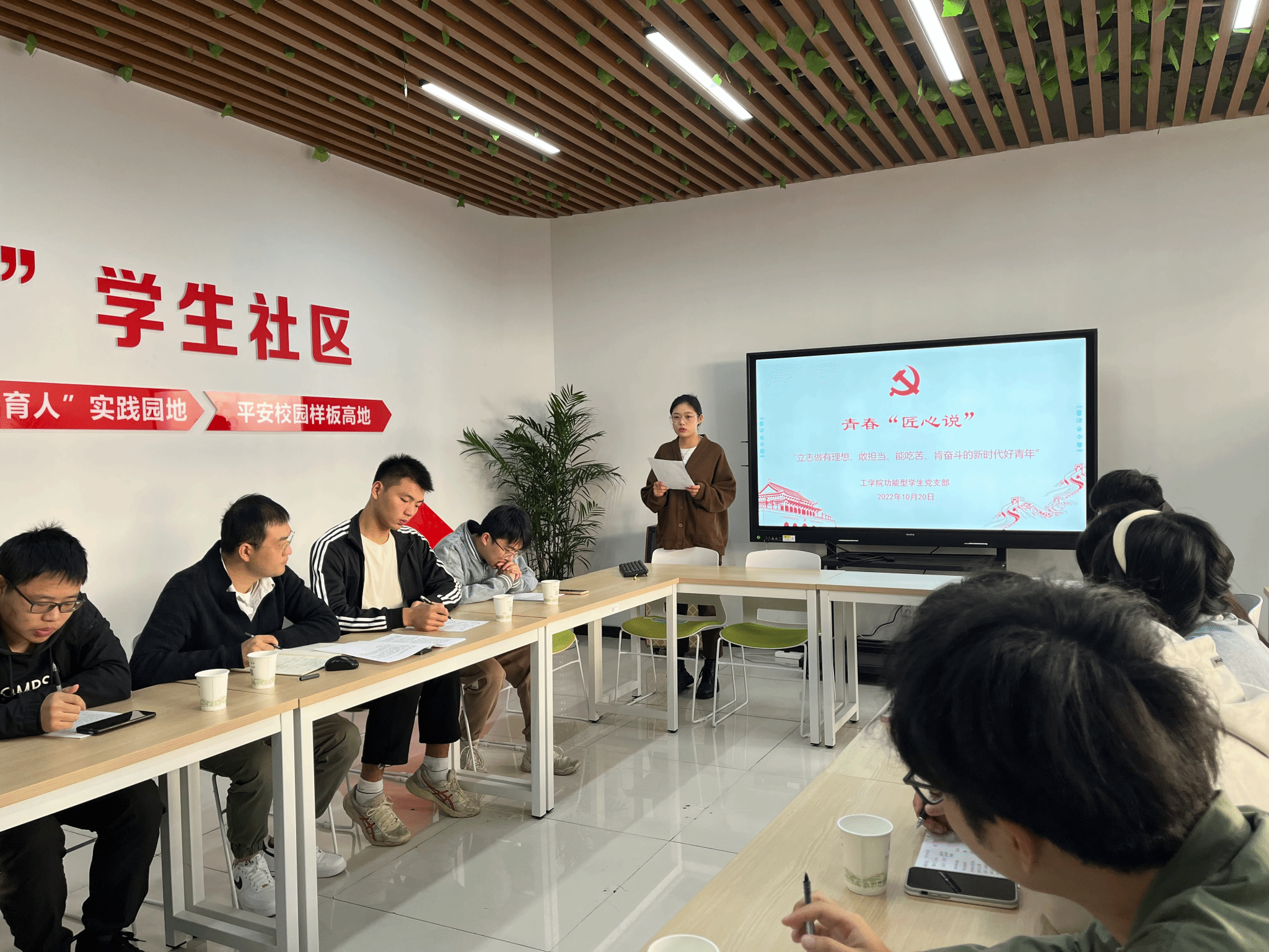 活动通过组织全体与会人员专题学习党的二十大报告精神为切入点,引导党员同学们围绕“立志做有理想、敢担当、能吃苦、肯奋斗的新时代好青年”开展“青春匠心说”主题活动,学生党员栗昕羽、徐轶南、赵梦薇先后结合党的二十大精神学习感悟和工作生活实际,同支部党员、入党积极分子进行了交流发言,激励与会的青年学生党员和入党积极分子进一步坚定理想信念、勇于担当奉献、矢志砥砺奋斗。