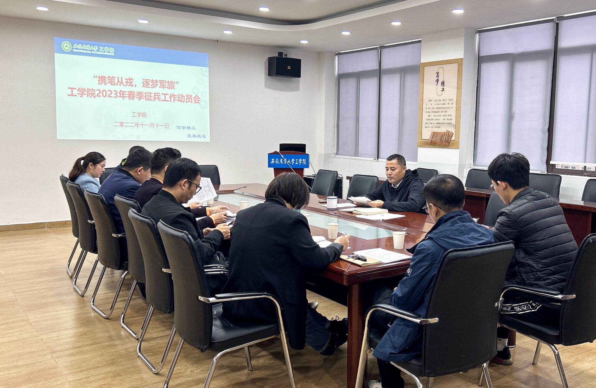 本网讯 为提前谋划好2023年春季征兵工作,11月11日上午8:30,工学院党委组织召开征兵工作动员会,学院党委副书记、纪委书记、副院长张国学主持会议。