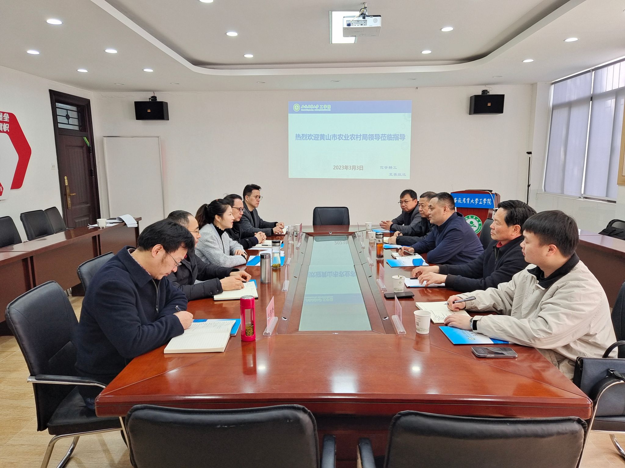 本网讯 3月3日上午,黄山市农业农村局党组成员、总农艺师詹洪亮一行来院调研交流。工学院党政领导、农业机械系部分教授代表热情接待了来访人员,并在学院门厅会议室进行了座谈交流。