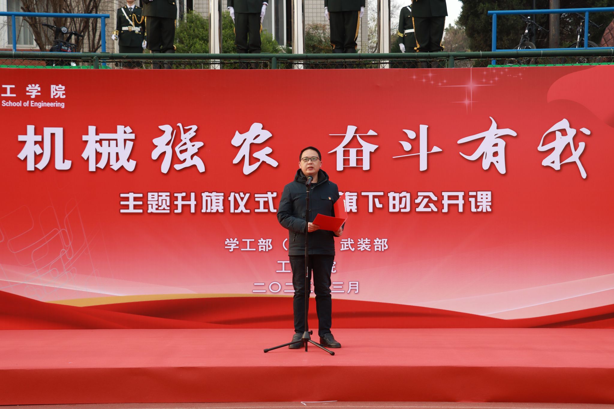 本网讯 3月27日早晨,工学院在校第一运动场举行“机械强农 奋斗有我”主题升旗仪式暨国旗下的公开课。校学生处领导、老师,学院党政领导、专职辅导员和2022级全体同学参加了此次活动,学院党委副书记张国学主持活动。