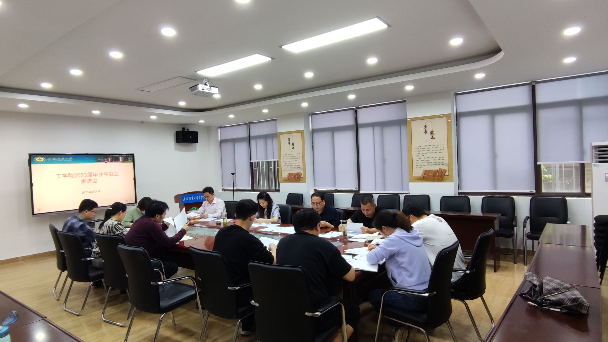 本网讯 5月4日,工学院在二楼门厅会议室召开2023届毕业生就业工作推进会,全体院领导、系主任、毕业班辅导员参加会议。