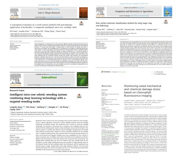 本网讯 近日,工学院权龙哲教授智能农田管理装备团队连续在国际权威期刊《Soil & Tillage Research》(IF=7.4,中科院一区,TOP),《Computers and Electronics in Agriculture》(IF=8.3,中科院一区,TOP),《Biosystems Engineering》(IF=5.1,中科院一区,TOP)、《Frontiers in Plant Science》(IF=5.6,中科院一区,TOP),发表了题为“A conceptual evaluation of a weed control method with post-damage application of herbicides: A composite intelligent intra-row weeding robot”,“Row anchor selection classification method for early-stage crop row-following”,“Intelligent intra-row robotic weeding system combining deep learning technology with a targeted weeding mode”和“Monitoring weed mechanical and chemical damage stress based on chlorophyll fluorescence imaging”的四篇研究论文。这四项成果分别解决了损伤施药除草的生物学原理、农田机器人自动驾驶技术、农田机器人株间除草控制方法、损伤施药机器人的高光谱防效评估等问题,为农田抗性杂草防控及农业可持续发展开辟了新思路。