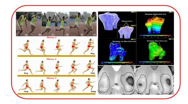 模拟三级跳运动员助跑、腾跃、落地的动力学过程,揭示了膝关节冲击损伤的生物力学机制。