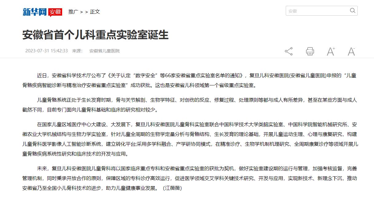 本网讯 近日,从安徽省科学技术厅获悉,安徽省儿童医院联合安徽农业大学(机械结构与生物力学朱林教授团队)、中国科学技术大学(类脑实验室李厚强教授团队)共同申报的“儿童骨骼疾病智能诊断与精准治疗安徽省重点实验室”成功获批。这是安徽省儿科领域第一个省级重点实验室,也是安徽农业大学工学院增添的机械学科交叉发展的重要研究平台。
