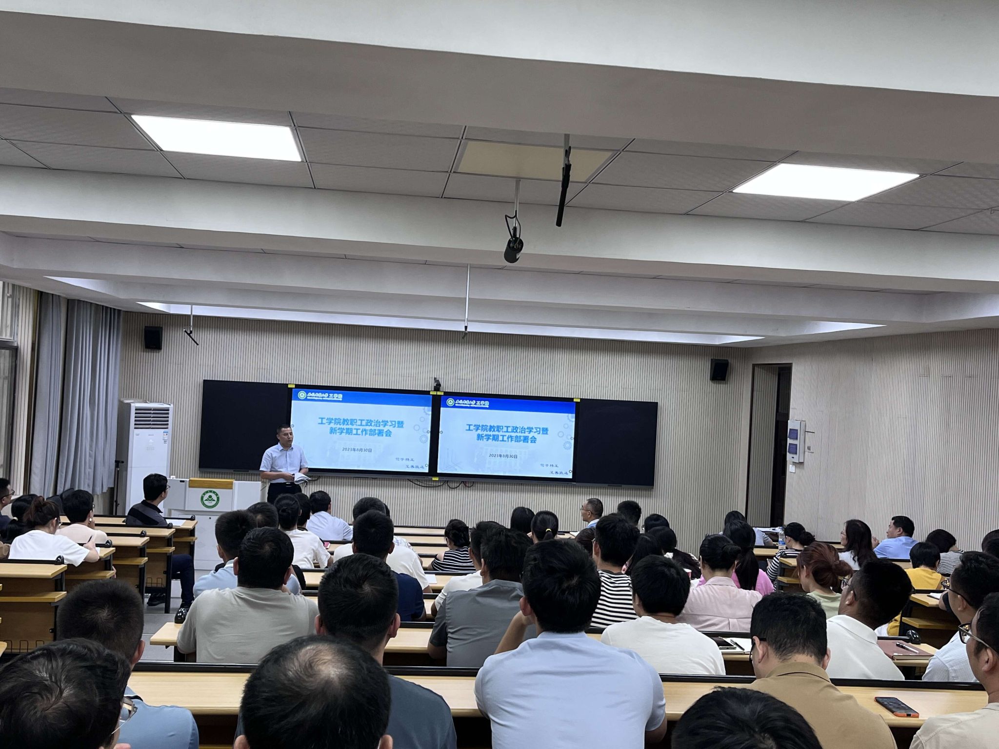本网讯 8月30日下午,工学院在三教101室召开新学期全体教职工大会,聚焦推进“思想大解放、能力大提升、作风大转变、任务大落实”专项行动。会议由院党委副书记(主持工作)张国学同志主持。