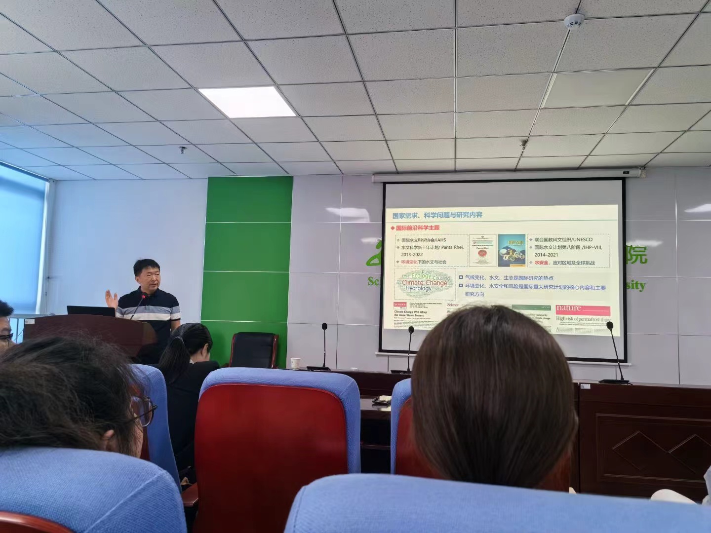 王国庆深入浅出地阐述了所研究的热点问题,指明环境变化、水安全和风险是国际重大研究计划的核心内容和主要研究方向,重点介绍了气候、下垫面及水文演变,模型改进及生态水文模拟,径流对气候和下垫面响应。在研究方法上,他介绍了识别气候变化和人类活动对区域水文过程的影响、静动态下垫面下生态水文过程模拟以及模型效果。最后,基于水热耦合方程和水文模拟的径流归因识别,对黄河源区未来气候变化趋势及径流量变化趋势进行了预测。与会师生就学术报告相关内容与王国庆进行了深入交流。