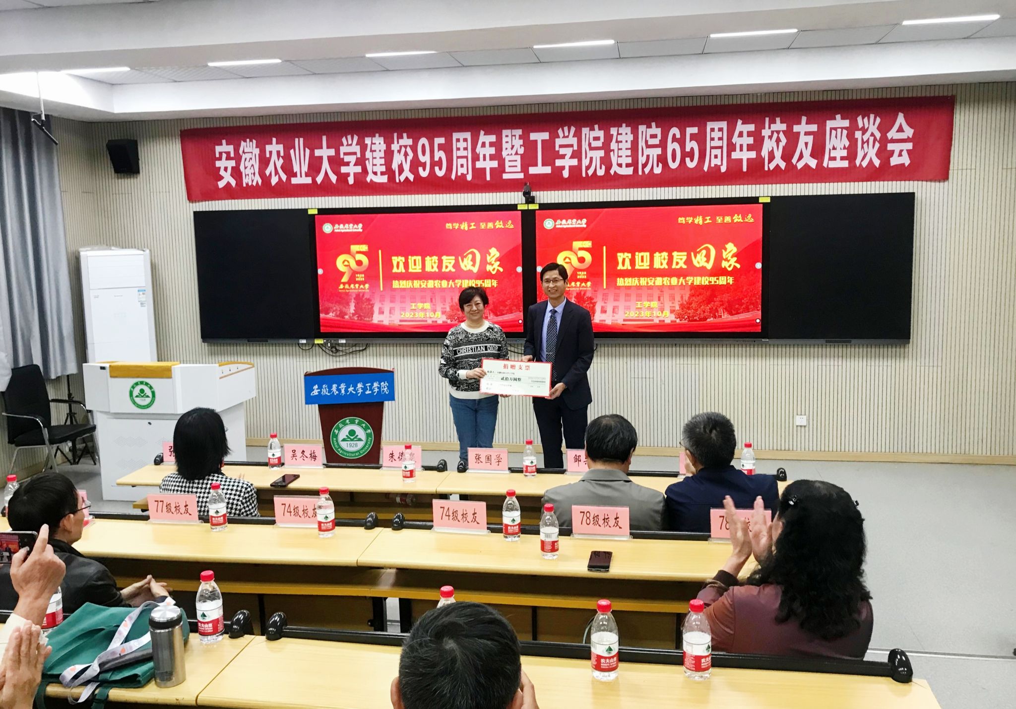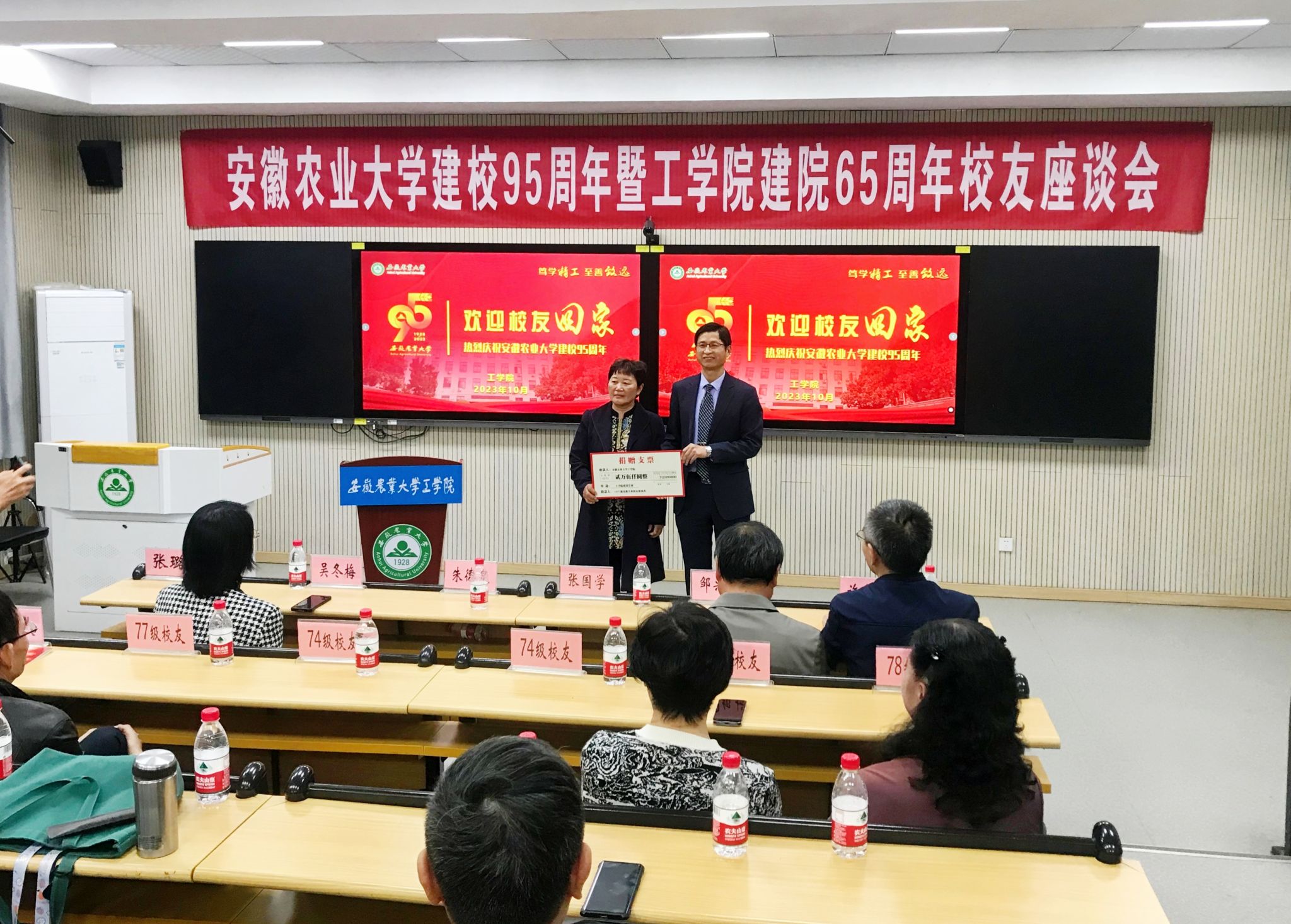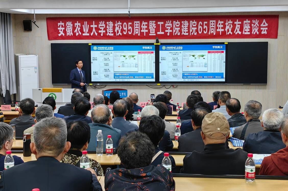 任宜敏、左振国、王文波、卢玲、吴健等校友代表介绍了各自毕业后的事业发展情况,畅谈感慨体会,深情回忆了曾经在安农的求学时光,对老师们传道授业解惑的恩情表示感激。校友们对学院65年来的办学成绩给予了高度肯定,对学院的发展进步感到无比自豪,祝福工学院继续奋楫扬帆、风华隽永,书写新时代高质量发展新篇章。