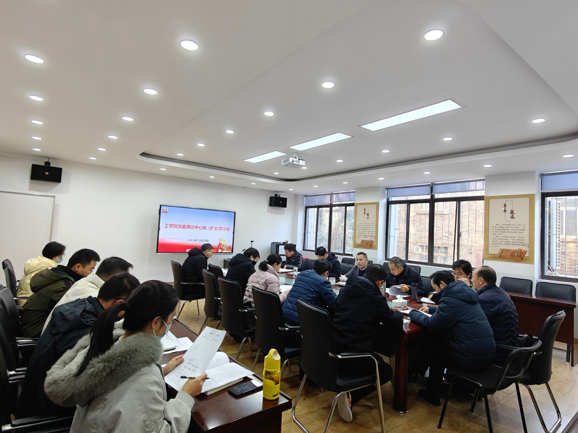 本网讯 12月22日上午,工学院在三教二楼会议室召开党委理论学习中心组(扩大)学习暨推进新工科建设会商会议,院党委委员、系部(中心)主任、党支部书记参加会议。院党委书记张国学主持会议。
