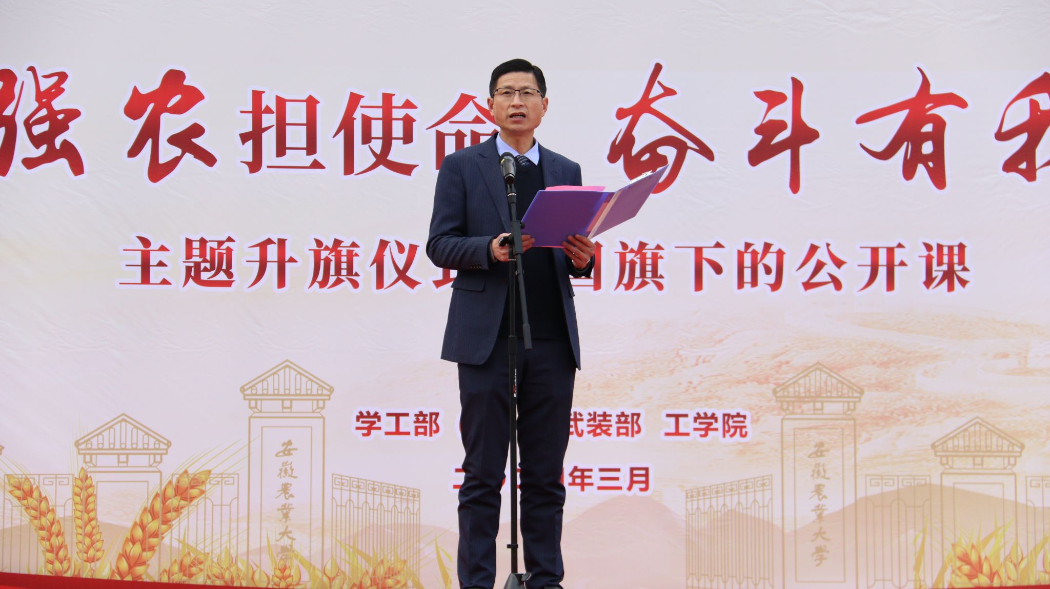 本网讯 3月18日早晨,工学院在校第一运动场举行“机械强农担使命 奋斗有我逐梦行”主题升旗仪式暨国旗下的公开课。校学工部(处)、武装部副部长卢伟参加活动。学院党政领导、全体专兼职辅导员和2023级全体同学参加了此次活动,学院党委副书记张璐主持活动。