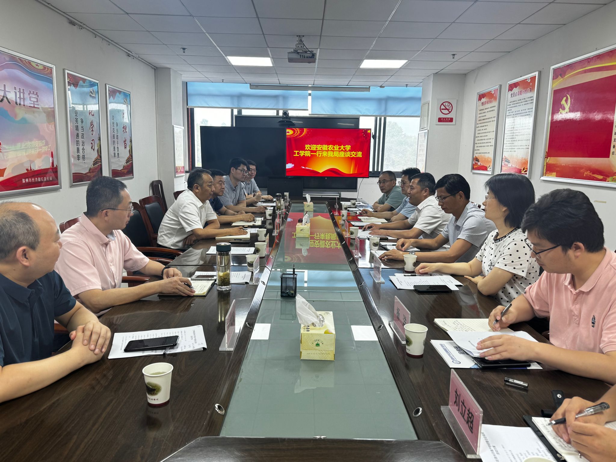 上午,学院一行首先前往滁州市工信局看望我院挂职干部孙兴冻老师,并开展座谈交流。滁州市工信局党组书记、局长陈军以及副局长王昌龙分别介绍了滁州市经济社会发展和信息化发展等情况,并对孙兴冻老师在挂职期间的工作情况给予了高度评价和充分肯定。学院党委书记张国学、院长朱德泉分别介绍了工学院的发展历程、人才培养、科研攻关和学科建设等情况。座谈中,双方就如何进一步加强校地合作、共建创新研究院等进行了深入交流。