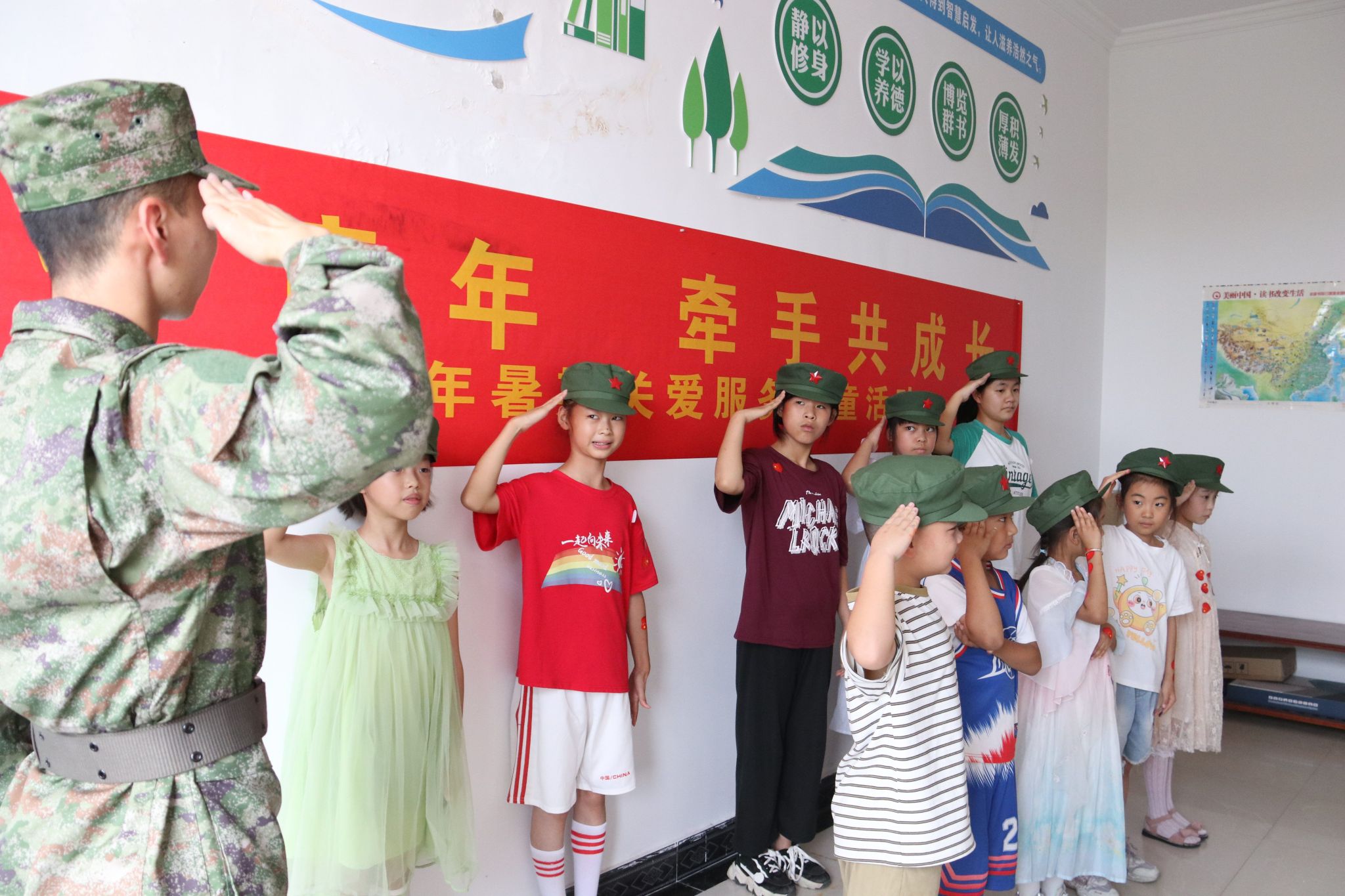 以劳健体,锤炼钢铁意志。为增强孩子们体魄,培养孩子们的纪律性,实践团开展了一系列军事训练活动,如教授敬礼、擒敌拳、站军姿等军事基础技能。活动中,孩子们学习标准的敬礼动作,小小的手高高举起,天真无邪的眼神,无不透露着对军人的敬仰。