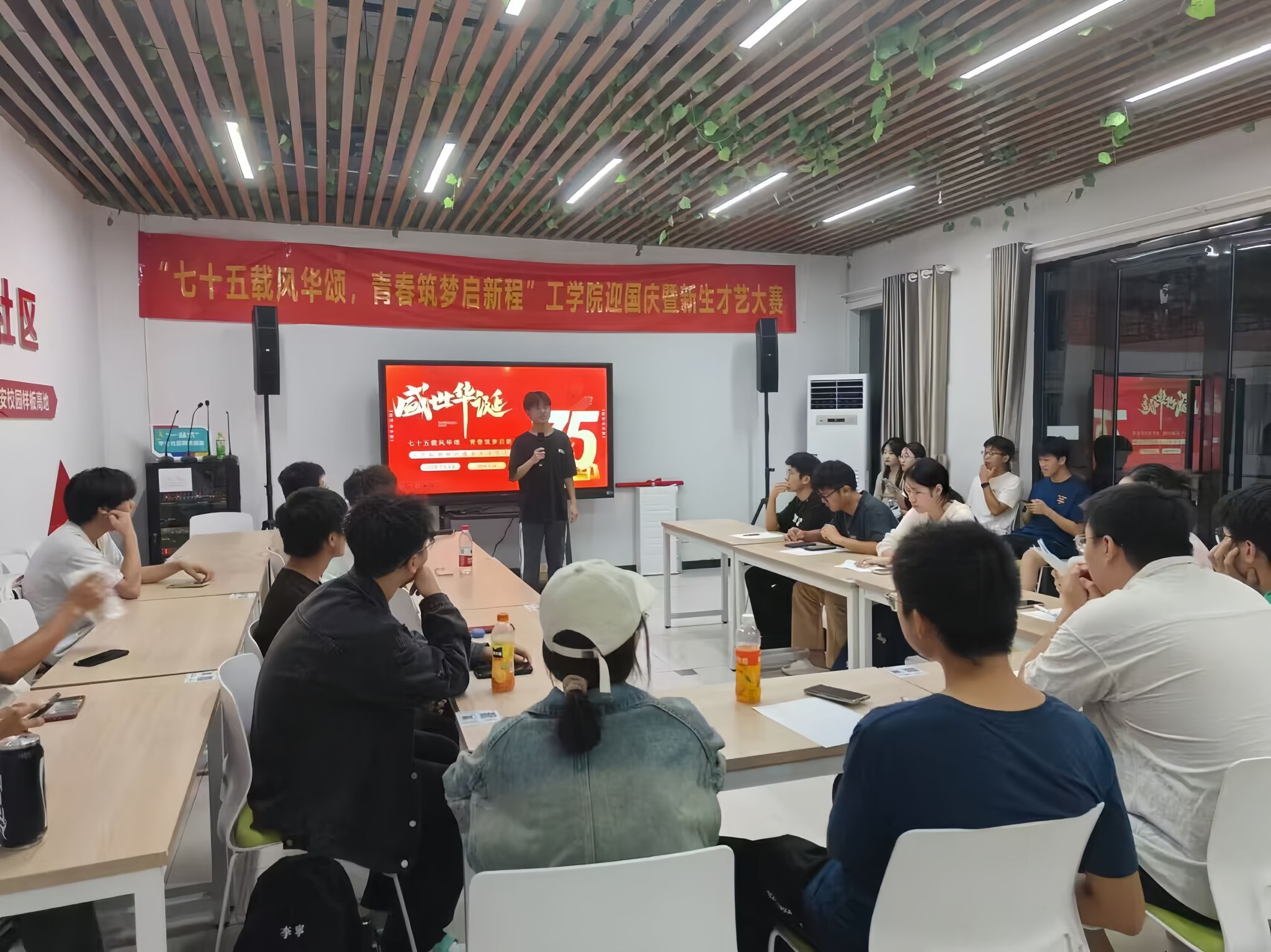 本网讯 9月28日晚,工学院在大学生公寓“一站式”学生社区服务中心多功能活动室举办“七十五载风华颂,青春筑梦启新程”迎国庆暨新生才艺大赛,共同礼赞伟大祖国的辉煌成就,大力弘扬“奉献、创新、奋斗”的安农精神。