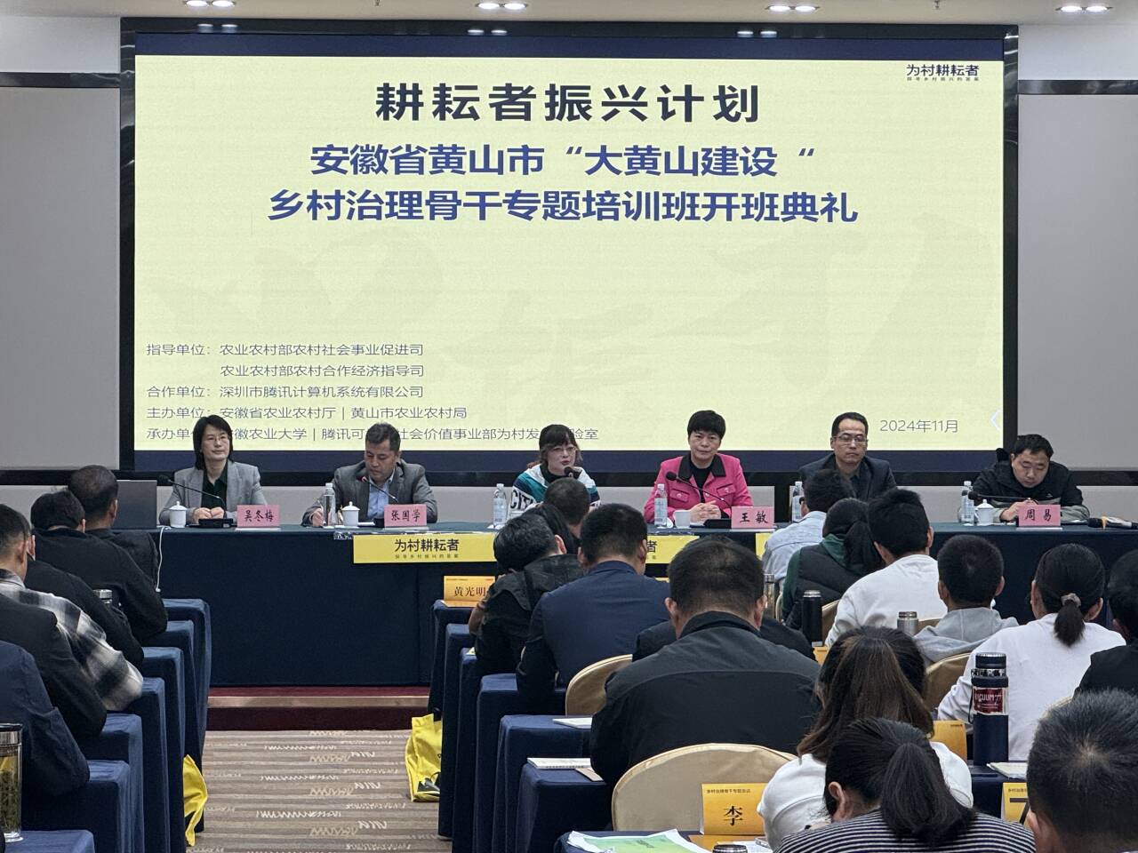 本网讯 为贯彻落实党的二十大精神,深入推进乡村振兴战略实施,11月12日,我校承办的“耕耘者振兴计划”黄山市“大黄山建设”乡村治理骨干专题培训班开班。安徽省农业农村厅农村社会事业促进处副处长刘婧、黄山市农业农村局副局长王敏、我校乡村振兴学院副院长李玮、工学院副院长吴冬梅、中共黄山市委组织部三级主任科员周易出席开班仪式。我校工学院党委书记张国学主持开班仪式,来自黄山市区、县级单位干部、乡镇级干部、拟作为“乡村治理”示范村庄的村支书学员共60人参加本次培训班。