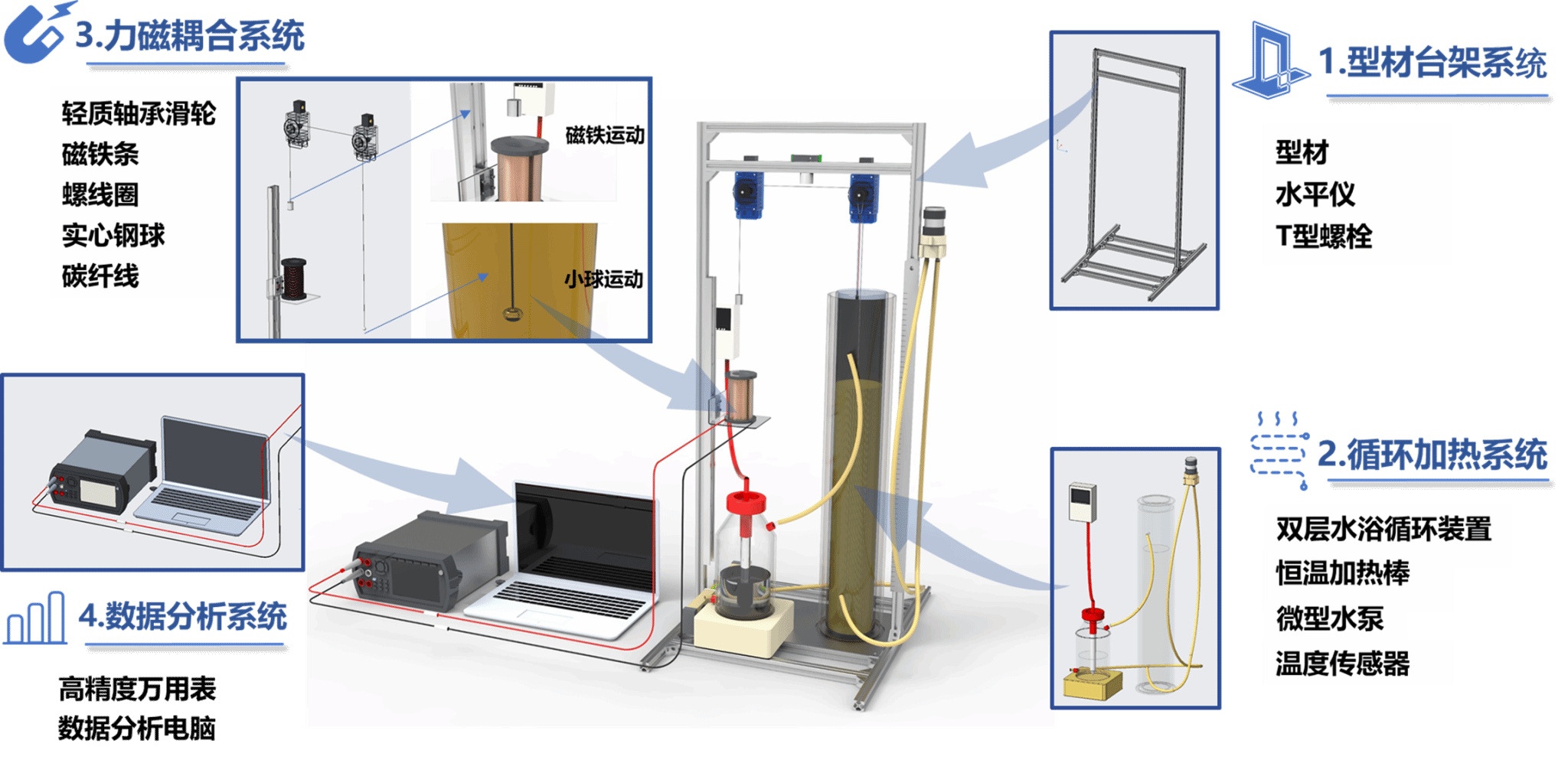 本次参赛作品主要针对传统落球法测量液体粘滞系数实验中存在的问题,受法拉第电磁感应启发设计并制备了一套由型材台架系统、循环加热系统、力磁耦合系统和数据分析系统组成的液体粘滞系数测量综合性实验系统。在本测试系统中通过协同精准调控小球直径和磁铁重量可以有效降低实验误差,提高测试精度,当采用直径9 mm的小球测量液体粘滞系数时,相对误差仅为0.12%。本测试系统兼容升球法和落球法,利用力磁耦合作用实现了匀速速度测量的简单可视化,摆脱了传统落球法中粘滞系数测量对液体透明度的限制,为液体粘滞系数的测量提供了新思路。决赛准备期间,物理系多次组织对参赛作品进行全面打磨,工学院领导和相关老师针对作品也提出了建设性的修改意见和建议。