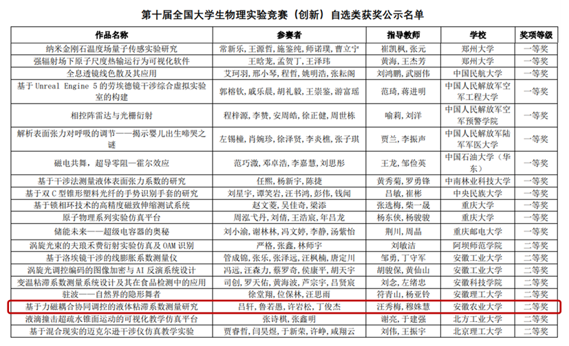 本网讯 11月22日至24日,国家级A类赛事第十届全国大学生物理实验竞赛(创新)在北京航空航天大学举行。工学院参赛作品《基于力磁耦合协同调控的液体粘滞系数测量研究》(指导教师:汪秀梅、穆姝慧,团队成员:吕轩、鲁若愚、许岩松和丁俊杰)经过初赛,成功晋级线下决赛,并荣获全国二等奖。