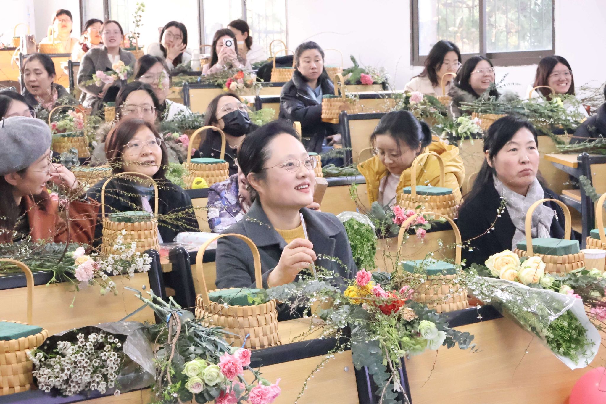 巧手织春意 花语寄匠心 王华老师以《“会呼吸”的国风花篮》为主题,带领女教职工体验插花艺术。从花材甄选、色彩搭配到意境营造,王老师深入浅出地解析创作精髓。一件件错落有致的花艺作品,装满了女老师们对美好生活的诗意追求。