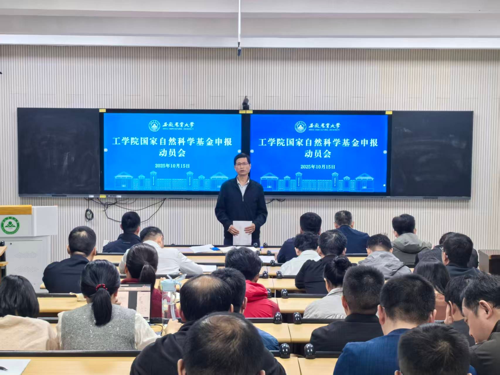 本网讯 10月15日下午,工学院召开2026年度国家自然科学基金项目申报动员会。会议由学院党委书记张立付主持,学院院长朱德泉作动员讲话。