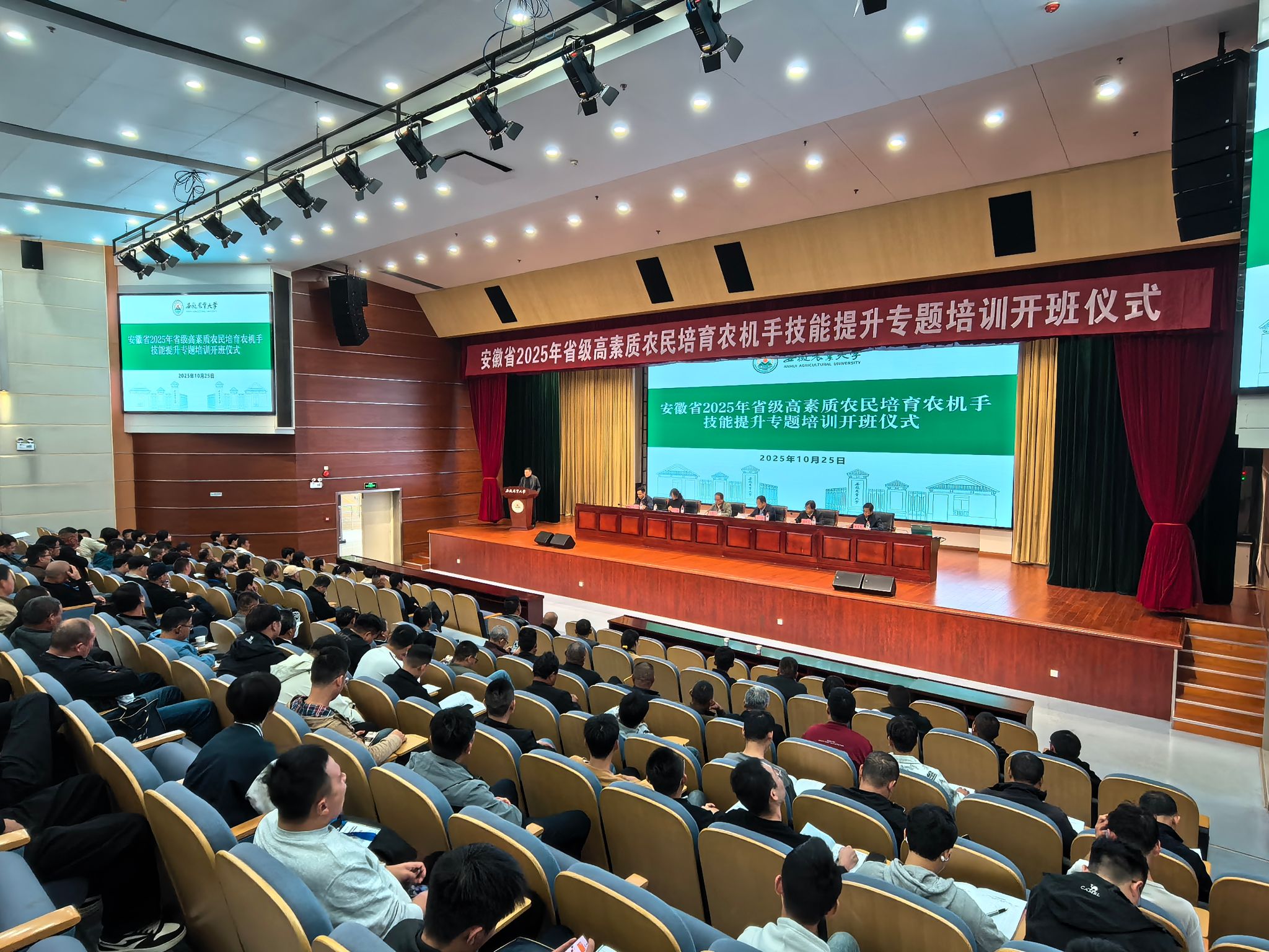 本网讯 10月25日上午,安徽省2025年省级高素质农民培育农机手技能提升专题班开班仪式在学校图书馆第一学术报告厅举行。安徽农业大学党委常委、副校长陈黎卿,安徽省农业农村厅农业机械化管理局局长刘成美、农村社会事业促进处副处长刘婧,工学院党委书记张立付、院长朱德泉出席开班仪式。仪式由学校乡村振兴学院、继续教育学院院长刘鹏凌主持。来自全省各地的200名农机手学员参加开班仪式。