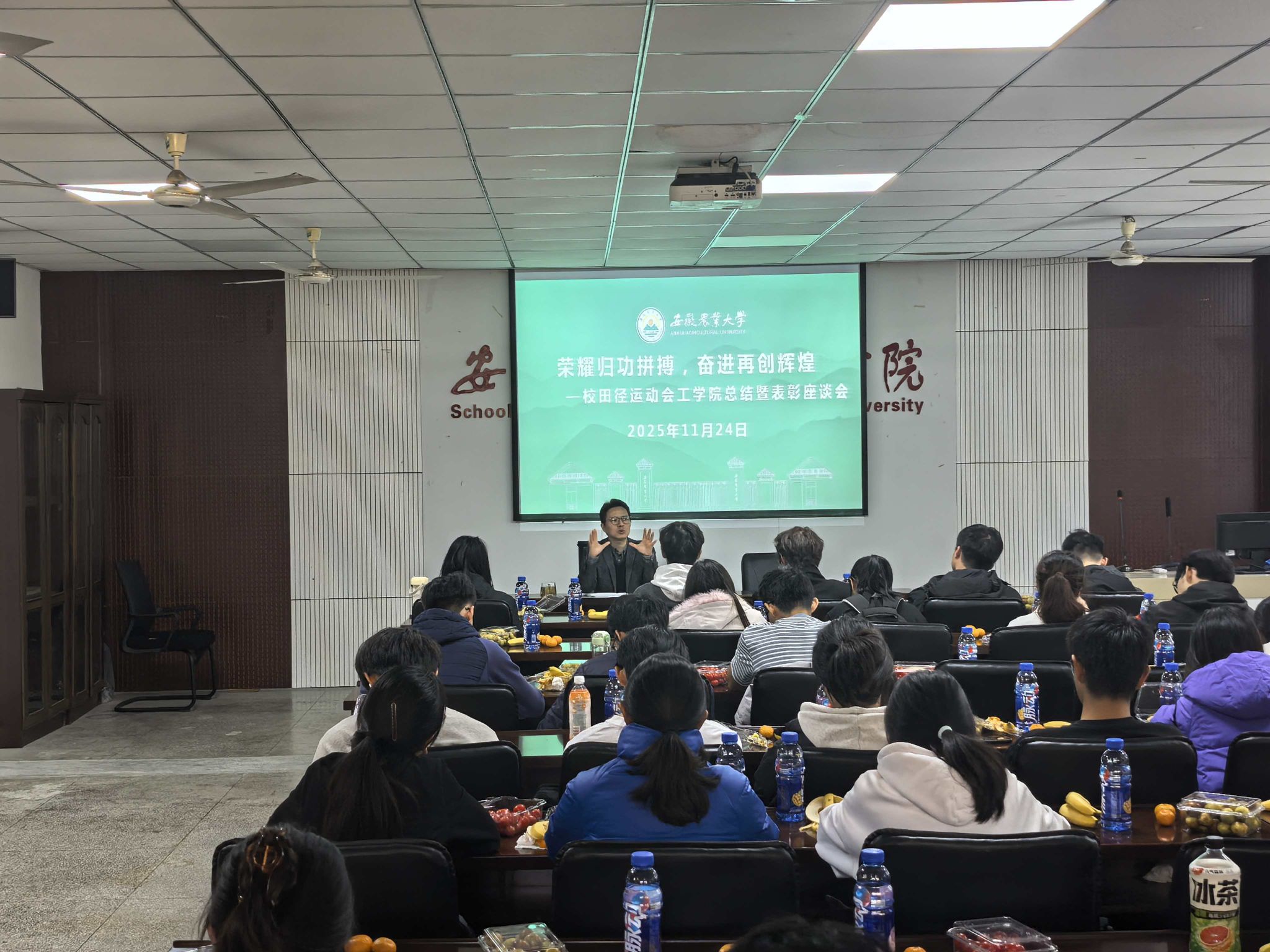 本网讯 11月24日中午,工学院在202教室召开校第六十届田径运动会总结暨表彰座谈会。工学院党委副书记张璐、学院体育赛事负责老师胡家瑞、院学生会体育部全体成员及全体参赛运动员参加座谈。