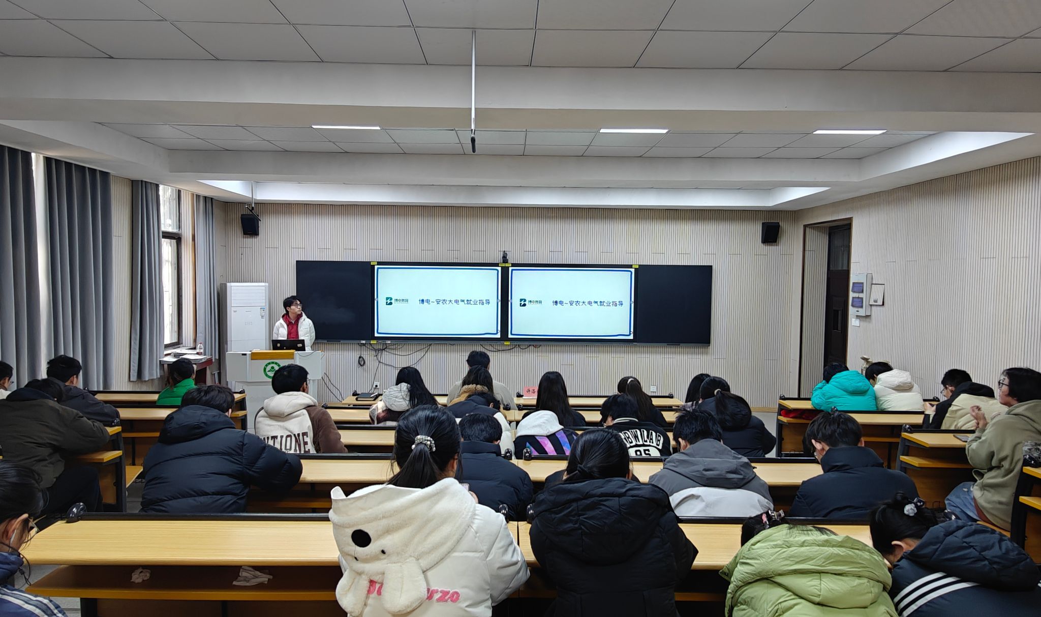 讲座分为考研、考电网两个专题部分,“国家电网备考与求职”部分系统解读了国家电网的招聘政策、招录流程与最新动向,并结合今年的数据与案例,详细分析了安徽省内各地市单位的报考竞争情况、岗位特点与发展前景,对笔试备考内容、面试要点及备考策略进行了专业指导,为学生提供了清晰、实用的报考指南。“电气专业考研规划”部分围绕院校选择、复习规划、科目备考等关键环节,深入分析了安徽大学、合肥工业大学、上海电力大学等电气类考研热门院校的招考形势与备考建议,结合自身实例,分享了科学的时间管理方法与高效复习技巧,并引导学生将考研选择与长远职业发展相结合进行综合考量,进行长远规划。