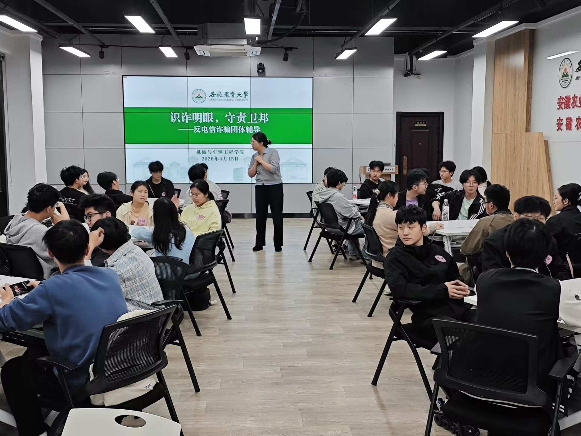 做一场反电信诈骗团体辅导。4月15日下午,“识诈明眼,守责卫邦”反电信诈骗团体辅导在“一站式”学生社区(南区)开展。活动以真实案例为切入点,将电信诈骗防范置于国家安全的视野下进行解读,引导同学们认识到:每一条个人信息的泄露、每一次轻信转账,都可能被境外不法势力利用,进而威胁国家经济安全与信息安全。通过情景模拟、骗局拆解、互动问答等实践环节,同学们“做”反诈演练、“做”防骗测试,在行动中练就识诈明眼的真本领。大家分组模拟诈骗场景,现场演练应对策略,掌握了“不轻信、不转账、不泄露”的防范要诀,深刻理解“守好钱袋子就是守好国家安全防线”的道理,切实将反诈技能“做”到实处、“做”成习惯。