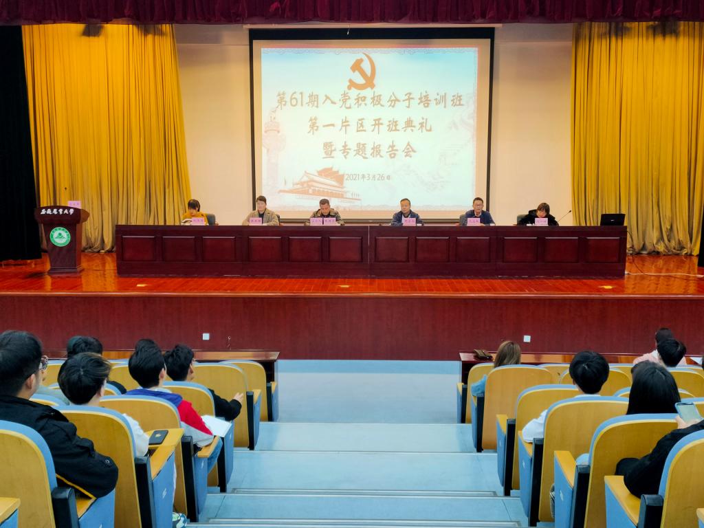 3月26日下午,校分党校第一片区第61期入党积极分子培训班开班仪式暨专题报告会在图书馆第一报告厅举行。园艺学院党委副书记鄢高翔、林学与园林学院党委副书记谈应权出席会议,第一片区全体党校学员和班主任参加了会议。会议由工学院党委副书记张国学同志主持。