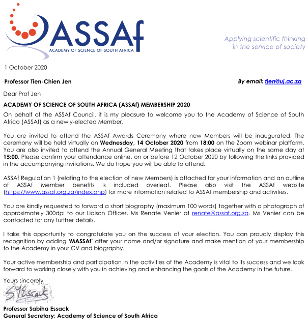 2020年10月1日南非国家科学院(ASSAf)发函:祝贺我校讲席教授任天健当选南非国家科学院院士,以表彰他在传热、机械增材制造领域的突出贡献。