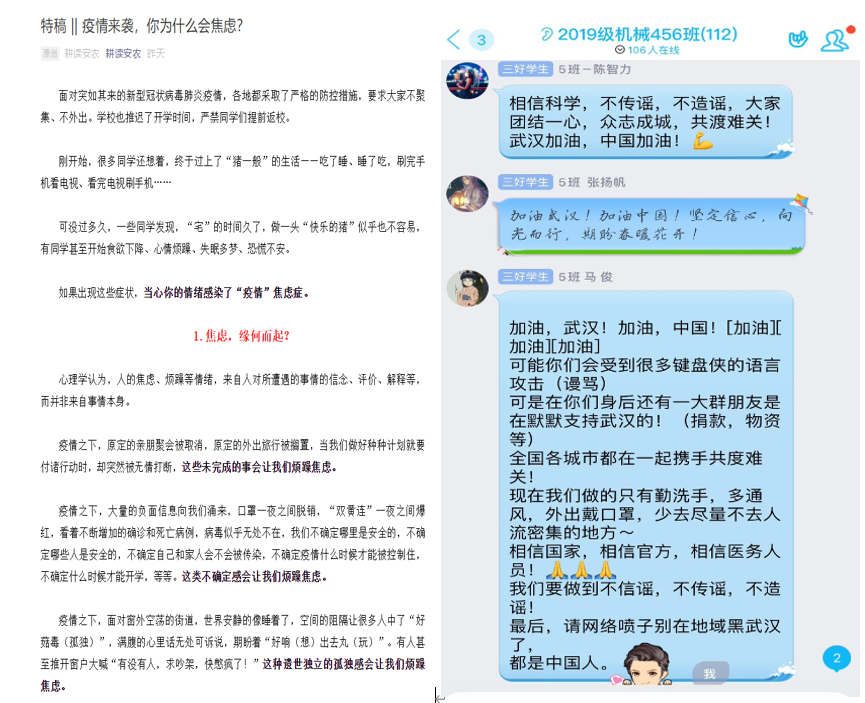 突出载体创新,提升工作实效。依托学院安徽省辅导员名师工作室项目,积极开展线上信息发布、宣传引导和咨询服务。工作室辅导员紧扣校党委疫情防控安排,运用“耕读安农”微信公众号,从不同角度,精心策划推出了《面对疫情,不瞒报是每位同学应尽的义务》《疫情之下,辅导员老师送你“十字箴言”》《疫情来袭,你为什么焦虑》等5篇网文,累计阅读量近10万次,点赞量超过600次,被高校思政网、高校辅导员联盟、安徽农业大学官微等微信公众号转载200多次,在学生中间产生了较大反响。