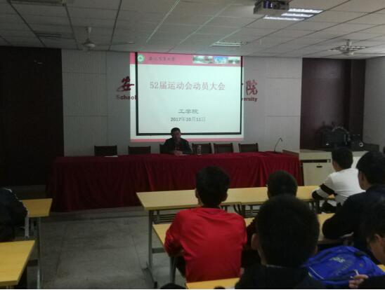 在52届校运动会将到来之际,为充分调动运动员的积极性,同时保障训练期间各项服务工作有序进行,10月11日中午,工学院在三教202组织召开动员大会。姚兴贵副院长出席并讲话,院全体运动员参加了动员会。