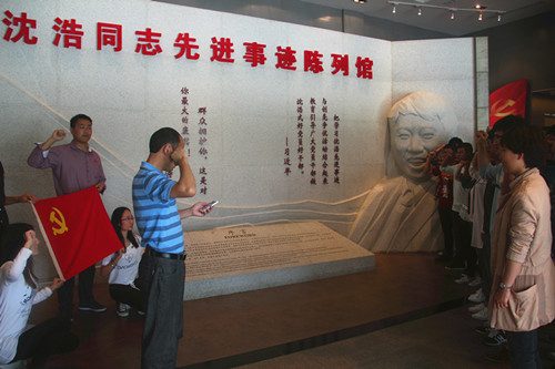 在沈浩同志先进事迹陈列馆前,孙福带领学生党员庄严宣誓,重温入党誓词。随后,全体人员认真观看了沈浩同志先进事迹图片以及他在小岗村工作时留下的文字、图片、实物等,参观了沈浩同志故居,真实地了解了沈浩同志“两任村官呕心沥血带领一方求发展,六载离家鞠躬尽瘁引导万民奔小康”的感人事迹,切身感受沈浩同志对党无限忠诚、对小岗村人民无限热爱、对工作无私忘我的精神。