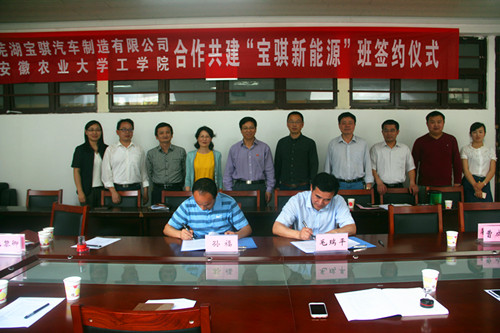 5月25日,我校工学院与芜湖宝骐汽车有限公司在三教二楼会议室举行签约仪式,合作共建工学院“宝骐新能源”班。芜湖宝骐汽车有限公司执行总经理毛瑞平和校党委常委、纪委书记裴树东出席仪式,校教务处、学生处相关领导、工学院党政领导及企业有关人员参加活动。