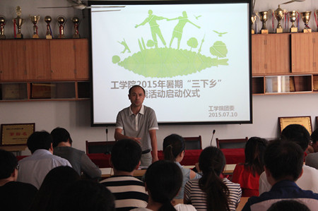 7月10日下午,工学院2015年暑期“三下乡”社会实践活动启动仪式在三教202会议室召开。学院党委副书记孙福出席会议,团队指导老师和全体“三下乡”社会实践团队成员参加会议。