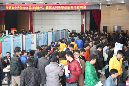 安徽省农垦集团大圹圩农场、安徽海螺集团、安徽合力股份、陕汽淮南专用汽车、安徽水安建设集团、合肥长安汽车、合肥晶弘电器、扬州江淮轻型汽车、黄山皖南机床、康佳同创电器、全柴动力股份、安徽中鼎密封件股份、安徽三联泵业股份、宁波高正(松)电子、平安产险、合肥美菱股份、合肥伊利乳业、正兴集团合肥车轮等77家企业参加了招聘会,提供了机械工程师、电气工程师、研发工程师、嵌入式开发工程师、生产工程师、规划设计专员、估价专员、查勘定损员、工程监理、工程造价、财务管理、国际外贸业务管理等1710余个就业岗位,涉及农机、机制、车辆、电气、农建、农水、计算机、网络工程、财务管理、工商管理、英语、管理类等多个专业。学院各系部主任、全体毕业班辅导员积极参会并指导学生择业。工学院、经济技术学院及部分兄弟学院1000余名毕业生携带简历积极参会并与用人单位进行了友好洽谈。下午,中安重工自动化装备、合肥惠利普电机、芜湖宝骐汽车、浙江万里扬变速器股份等单位对有意向的毕业生进行了宣讲和笔试、面试。
