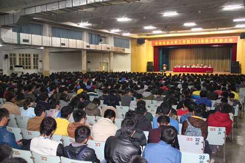 大会在庄严的国歌声中开幕。会上,学院党委副书记刘柳就2014年大学生思想政治教育与日常管理工作进行了总结,副院长朱德泉宣读了2013-2014学年先进班集体、先进个人及奖学金评定获奖名单及2014年度学生学术科技类活动获奖名单,副院长陈黎卿宣读了2014年度社会实践、宿舍文化创建、体育竞赛类活动获奖名单。2012级车辆专业程冠旻、2011级机制专业龚志文、2012级机制专业胡俊文等三位同学作为各类获奖同学代表发言。