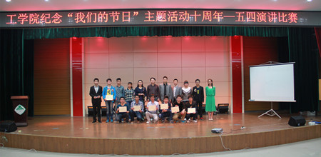 本网讯:5月5日晚,纪念“我们的节日”主题活动十周年演讲比赛决赛在欣苑食堂四楼多功能报告厅举办。校党委宣传部副部长黄洪雷、校团委副书记张健、工学院党委副书记刘柳和学生处相关负责老师、校学生会主要负责同学应邀担任评委并为获奖选手颁奖。来自工学院各年级的11名选手参加决赛。