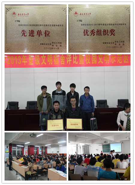 本网讯:11月22日上午,全校星级文明宿舍评比暨校园文明示范区建设表彰大会在图书馆报告厅举办。工学院在会上喜获星级文明宿舍优秀组织奖、校园文明示范区建设先进单位等奖项表彰。今年以来,工学院着力加强学生党员典型示范作用,以校院班三级学生干部为依托,以寝室长这支工作队伍为抓手,以星级文明宿舍评比为龙头,以“早起、早读、早锻炼”和寝室文化节系列活动为平台,以辅导员集体进宿舍常态化机制为保障,大力加强学生宿舍文明创建、文化建设等教育管理工作,取得了显著成效。