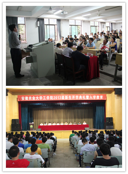 教授寄语开启大学生活新篇章。 9月8日下午,工学院2013级新生开学典礼暨入学教育大会在校大礼堂隆重举行。会议由工学院党委副书记刘柳主持,工学院党委书记陶志林、院长曹成茂、副院长朱德泉、副院长陈黎卿出席大会。出席会议的还有学院教授代表孔晓玲、尹成龙、郑泉及各系部主任。学院2013级新生辅导员、班主任及2013级全体新生参加了会议。曹成茂教授首先代表学院全体师生对2013级新生的到来表示热烈欢迎,并详细介绍了安徽农业大学和工学院的整体发展现状,就学院的专业特色发展、师资力量、基础设施以及取得的丰硕成果和未来5年的发展前景做了重要报告;他希望全体新生尽快适应大学的学习方式,独立自主,开启大学生活新篇章。随后,教师代表孔晓玲教授、老生代表顾雯同学和新生代表韩涛同学相继做了发言。陶志林同志在总结讲话中对全体新生提出了四点希望:希望全体新生志存高远、脚踏实地;希望全体新生树立专业自信、牢固专业思想、巩固专业知识;希望全体新生继承发扬艰苦奋斗的精神,发奋图强;希望全体新生努力学习、勤奋工作、自强自立,充实自己的大学生活,为了自己的中国梦而奋斗。
