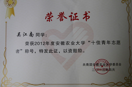 近日,安徽农业大学“十佳青年志愿者”评选结果揭晓,我院10级机械制造及其自动化专业学生吴江南荣获此荣誉称号。
