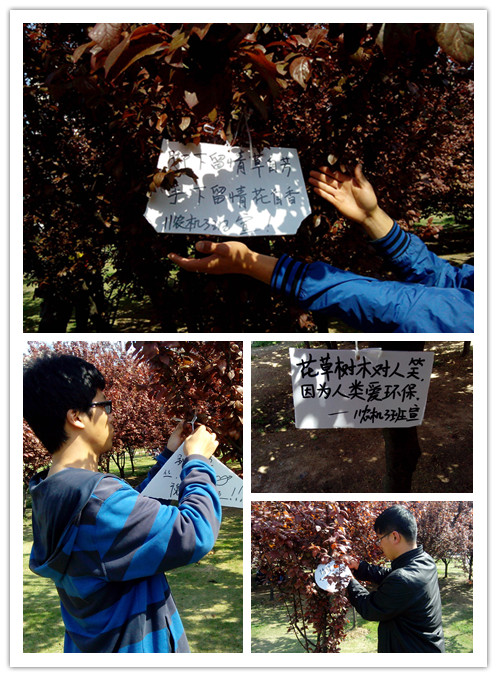 自今年二月份第一位感染H7N9的患者开始,健康、环境、卫生问题不得不再次被提上桌面。再想到2005年的非典型肺炎,我们认为“我的中国梦”还有一项应该是是所有中国人都有一个健康的身体。为什么病毒、流感肆意横行?为什么这么多人身体的抵抗力越来越差?很大一部分的原因是环境的恶化造成的。为了圆中国人都能拥有一个健康的身体的梦想,我们从宣传环保着手,在经济楼钱的树丛中挂起了写有宣传标语的树标,呼吁大家保护环境,爱护健康。