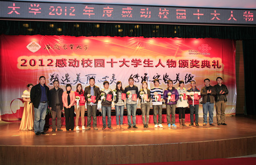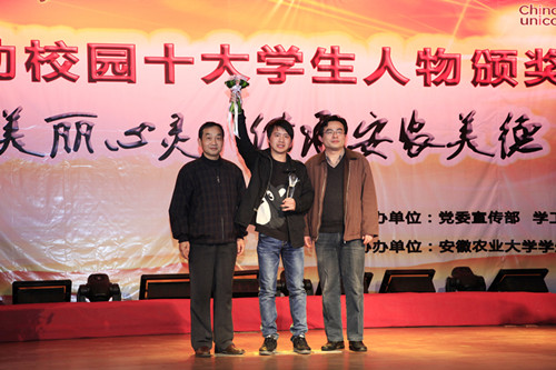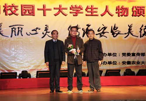 3月27日晚,安徽农业大学2012年度感动校园十大学生人物评选活动颁奖典礼在欣苑四楼学生活动中心多功能厅隆重举办。我院2009级机制专业痴迷科研的学术达人段雄波同学、2009级车辆工程专业助人自助的学生干部王冠元同学荣获2012年度感动校园十大学生人物,2009级机制专业褚娜娜同学、常志强同学以及2010级农业水利工程专业朱广军同学、2010级电气工程及其自动化专业俞凡同学荣获2012年度感动校园十大学生人物提名奖。