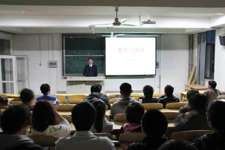 为充分发挥学生党员主体作用,发挥党支部的战斗堡垒作用,工学院学生第二党支部前期在09级同学中开展了学生需求调查,根据调查得知09级学生中普遍存在考研与就业的选择困惑。4月6日晚,支部在学院党委的大力支持下,邀请工学院副院长朱德泉教授在三教102教室为09农机、09机制专业同学开设了一场有关考研与就业的讲座。