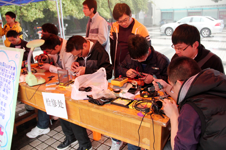 本次义务维修活动主要针对日常生活中常用的电子产品、常用电器,如MP3、MP4、电风扇、台灯、收音机、耳机等。在维修现场,同学们全神贯注,手持螺丝刀、电烙铁,凝视万用表,对报修的电器进行拆卸、检查、更换元件、整理线路、重新组装,认真做好维修工作。据悉,活动共收到来自全校师生送来的100余件问题电器,其中大半以上电器经同学们维修后可以继续使用,仍有一些电器经检测需要更换购买新的零部件,暂不在本次服务之列。