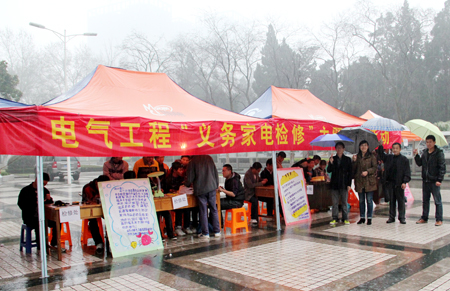 3月30日,工学院09级电气工程及其自动化专业在勤学楼广场组织开展了家用小电器维修志愿服务活动暨专业课程实践活动,09电气全体同学参与了本次活动。院机电工程系副主任马德贵副教授亲临现场给同学们进行技术指导,学院党委书记陶志林、党委副书记刘柳同志到场观看活动。
