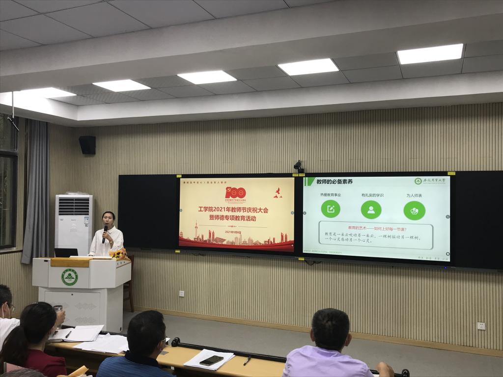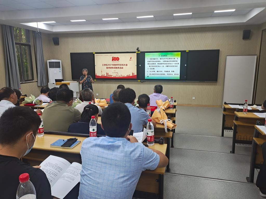 为持续推动党史学习教育,深入开展师德专题教育活动,在第37个教师节到来之际,9月8日下午,工学院召开2021年教师节庆祝大会暨师德专题教育活动,全院在职教职工、部分退休教师和学生代表参加会议。