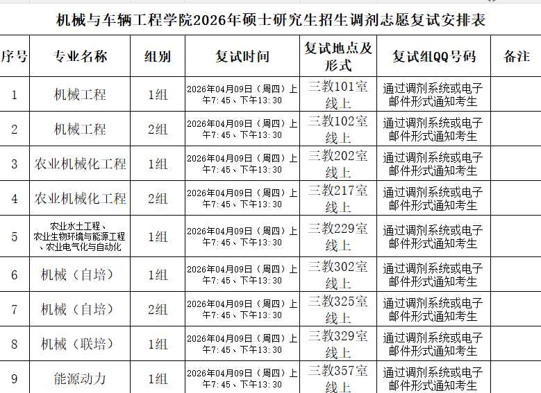 参加调剂复试的考生应按照我校研究生院官网招生工作栏2026年03月18日发布的《关于2026年硕士研究生考生准备资格审查材料的通知》要求,于2026年04月9日8:00前资格审查所有电子档材料(按照材料清单,整理成一个PDF文件,文件统一命名规则:专业名称_考生姓名_审查.PDF)发到1552251387@qq.com邮箱中,以方便学院对考生进行复试资格审核。
