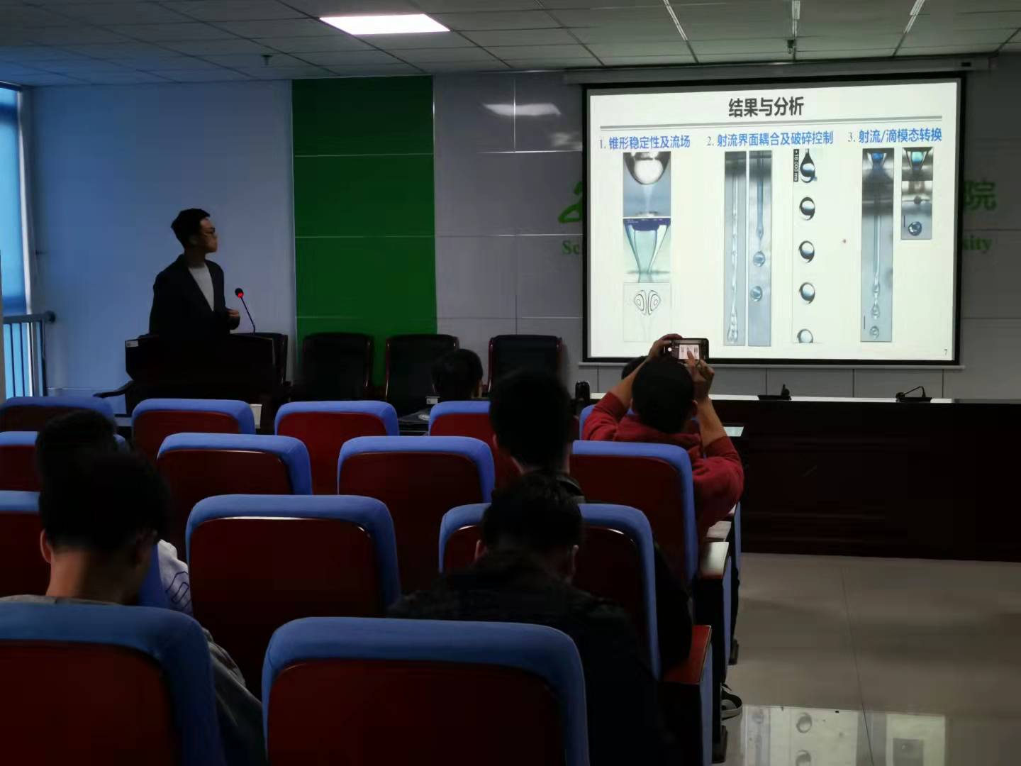 穆恺副研究员的报告内容丰富精彩,结合实验、数值模拟和理论分析方法,探究了同轴流动聚焦中锥形-射流的界面演化问题,并为全体师生展示了课题组最近几年最新研究成果,开拓了大家的眼界,全体师生受益匪浅。听完报告后,大家反响强烈,就相关问题与穆恺副研究员进行了交流讨论。与会师生纷纷表示,报告会内容对于大家在科研方法、论文撰写等方面均具有很强的指导和借鉴意义,收获很多。报告会结束后,在场师生再次以热烈的掌声表达了对穆恺副研究员的热烈感谢。