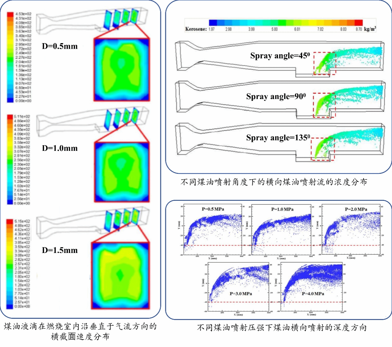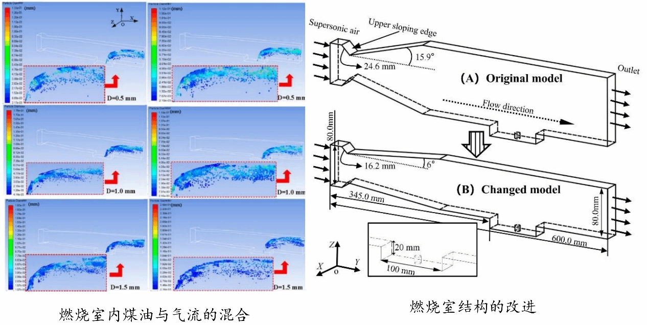 自2016年,工学院机械结构与生物力学实验室朱林教授团队,在徐胜利教授(现为清华大学宇航学院教授)的指导下,与中科大刘维来老师合作,在国家自然科学面上基金、重点基金等项目的支持下,深入研究了煤油喷嘴工况参数,如喷嘴尺度、喷嘴倾斜角度以及喷射压力对煤油―气流混合雾化质量的影响(图2)。同时,考虑到高速气流对燃烧室腔室结构的冲击效应,率先提出局部优化燃烧室几何结构,并进一步研究这种结构改变的可行性和有效性(图3)。