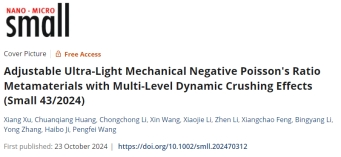 近日,我院徐翔副教授团队的最新研究成果《Adjustable Ultra-Light Mechanical Negative Poisson's Ratio Metamaterials with Multi-Level Dynamic Crushing Effects》被《SMALL》(影响因子IF=13,中科院一区)期刊发表,并被选为2024年第43期的封面论文。
